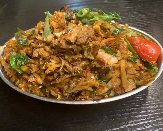 Spicy, semi-dry chicken stir-fry cooked with aromatic spices and curry leaves.